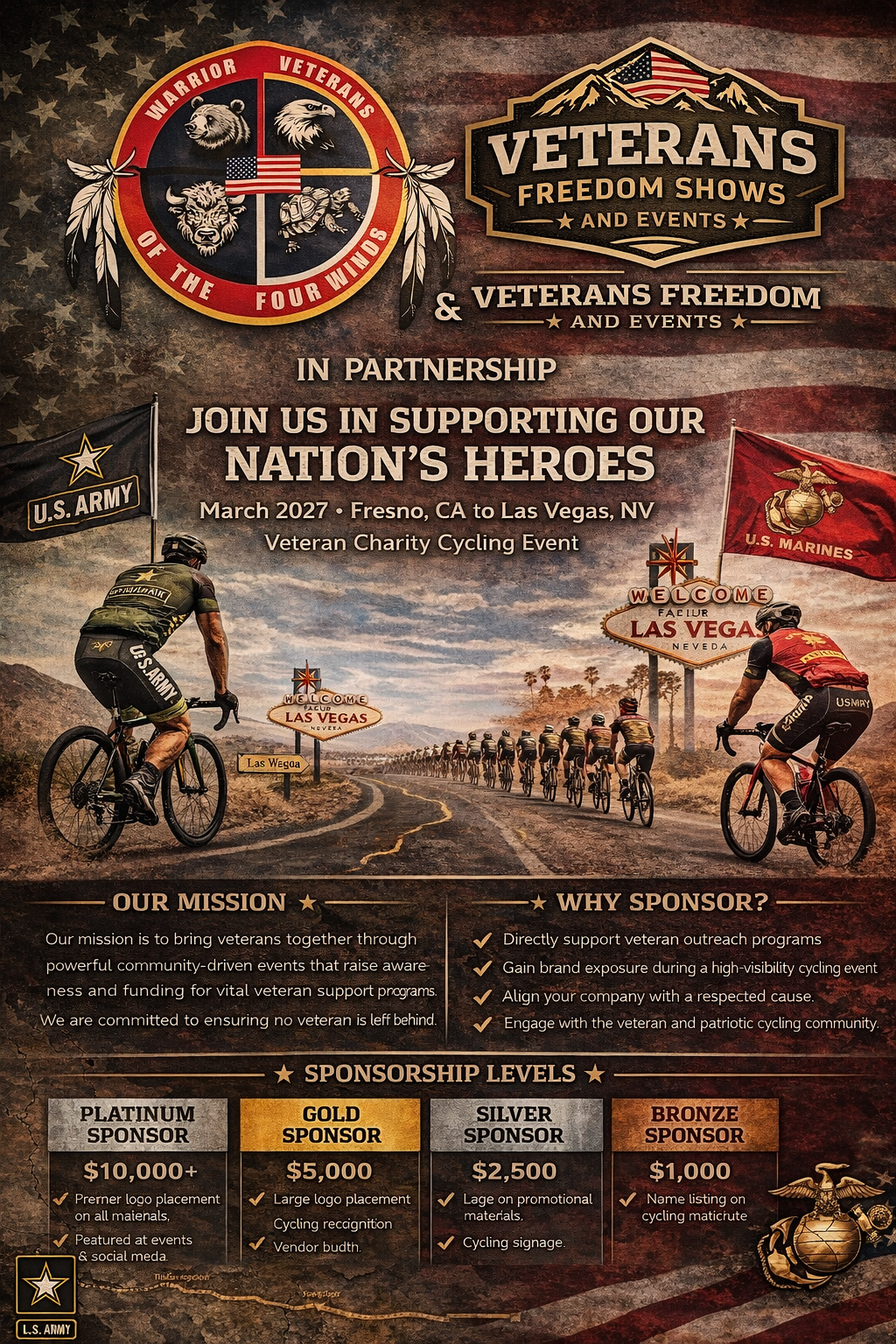 This event is a by mile donation. The minimum donation is $.50 per-mile up to what ever you would like to donate. You can donate either for David or Ed for the event or you can just donate for the event itself. The route will be Starting at the Clovis Veterans Memorial District on the March 8, 2027 0800 and we will end March 12, 2027 at the world Famous Las Vegas Sign at the start of the Strip.